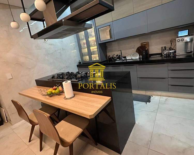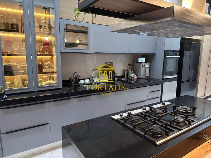 Cozinha ampla com iluminação planejada, piso em porcelanato, bancada em granito americana, armários planejados, coifa e ilha com cooktop