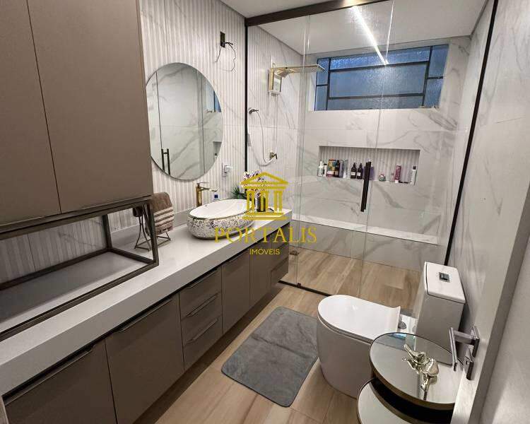 Banheiro social com teto rebaixado, iluminação planejada, bancada em granito, pia em cuba de apoio, armários planejadose box em blindex