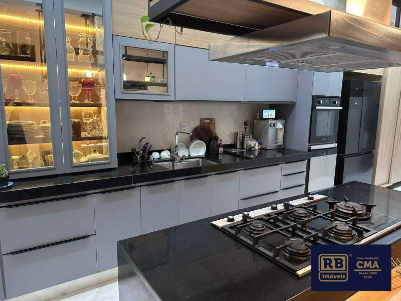 Área privativa gourmet completa com churrasqueira, coifa, bancada em granito, armários planejados, bancada americana e composta por painéis transparentes com vidro temperado