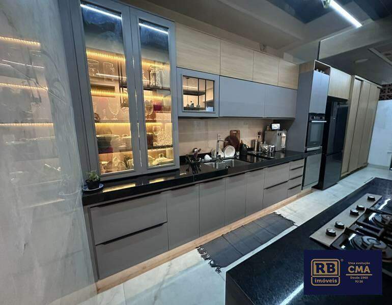 Cozinha ampla com iluminação planejada, piso em porcelanato, bancada em granito americana, armários planejados, coifa e ilha com cooktop