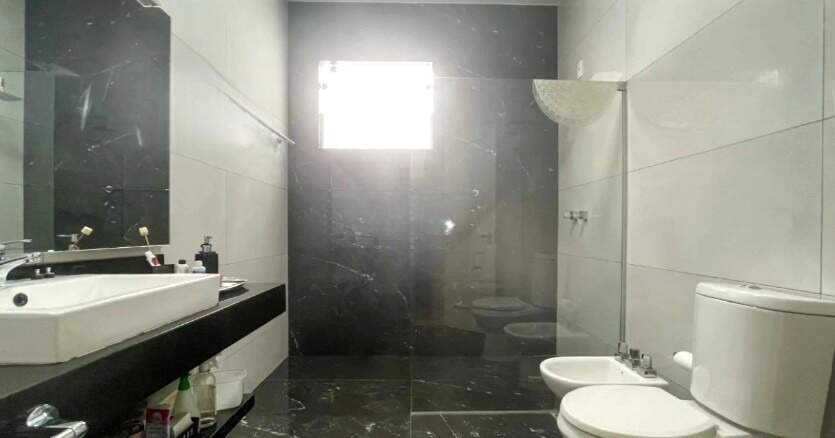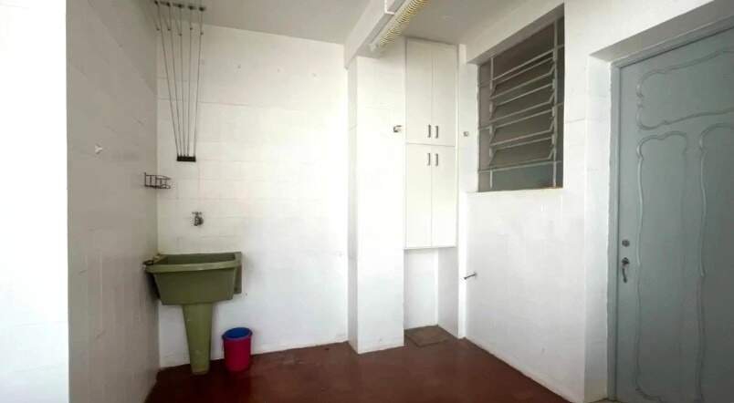 • Área de serviço espaçosa com piso em cerâmica, banheiro e pia.