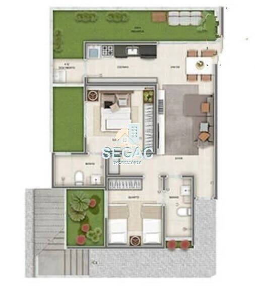 Sala ampla para 02 ambientes, varanda, 02 quartos confortáveis sendo 01 suíte, banheiro social, cozinha espaçosa e planejada estilo americana