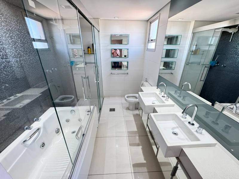 Banhos das suítes com bancada em granito ou nano glass, armários e box em blindex