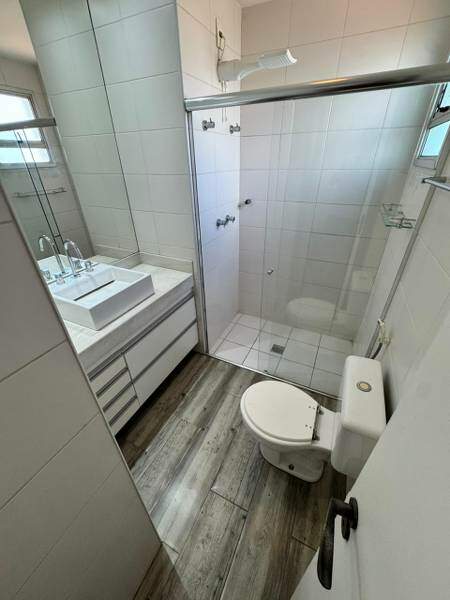 Banho social com bancada em granito, armário, espelho e box em blindex