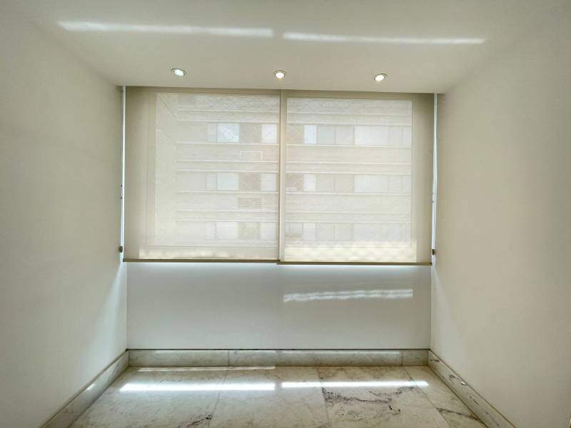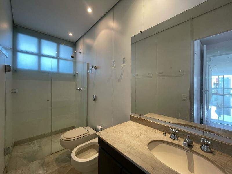 1 quarto amplo com piso em madeira envernizada, armários e iluminação planejados, teto com rebaixamento em gesso, sendo a suíte sofisticada, com revestimento em mármore, box em blindex com vidro transparente, banheira retangular embutida, bancada com pia em cuba de apoio e bidê